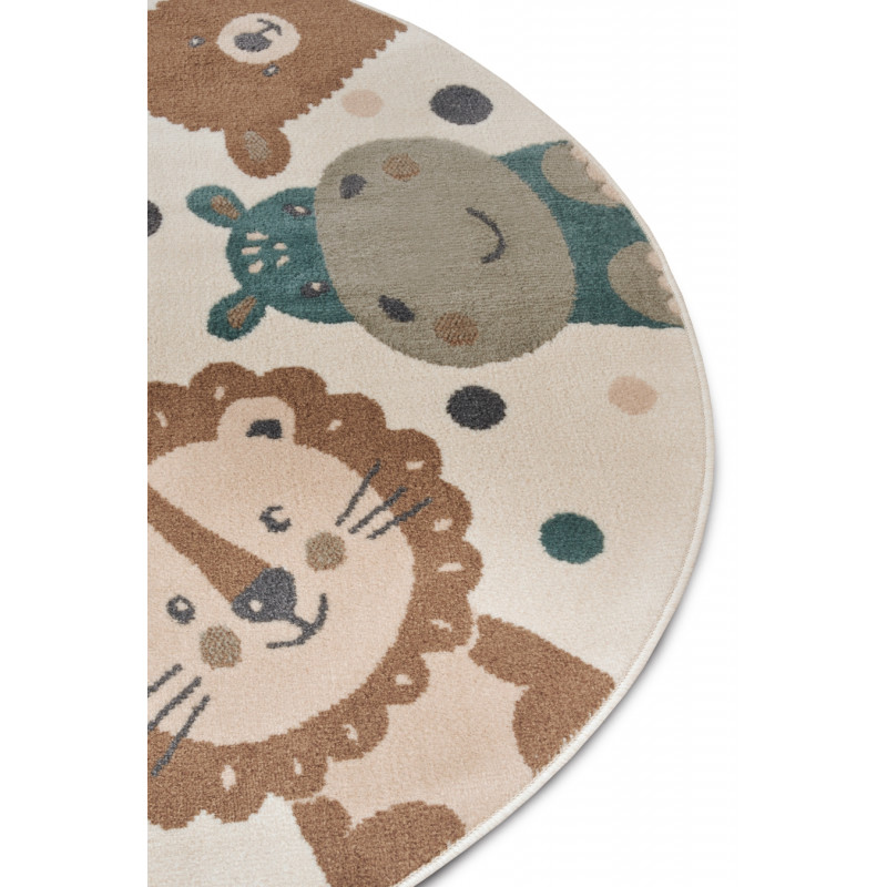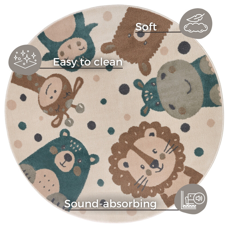 Krémově bílý kruhový koberec se zvířátky je skvělou volbou do dětského pokoje, kde vytvoří hravé a útulné prostředí. Jemné barvy a roztomilý motiv přinesou radost a styl zároveň. Koberec je vyroben ze 100% polypropylenového vlákna, což mu dodává měkkost a odolnost, takže je ideální pro každodenní hraní.