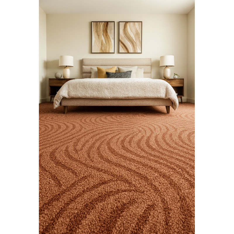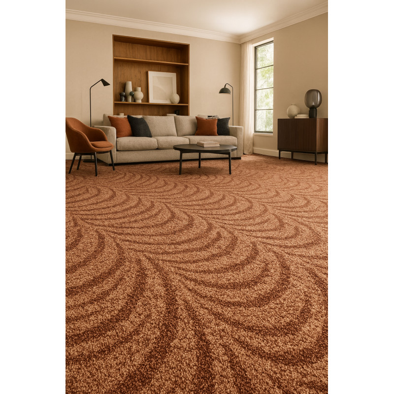 Metrážny koberec Spring 6440 Vás zaujme nielen svojím neobvyklým hrdzavým odtieňom, ale aj nápaditým plastickým vzorom. Ten vytvára vlas typu scroll, ktorý kombinuje utiahnuté a povolené slučky. Na rubovej strane je filcová podložka, vďaka ktorej koberec dobre izoluje chlad. Najlepšie padne do spálne alebo obývacej izby.