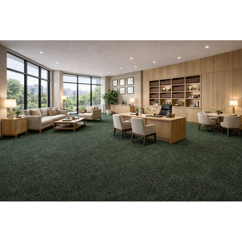 Tmavě zelený koberec udělá v každém komerčním interiéru parádu. Získá si Vás ale i celou řadou praktických vlastností. Je odolný, kompatibilní s kolečkovou židlí, snadný na údržbu a dobře tlumí hluk. To vše zajišťuje krátký smyčkový vlas a syntetická podložka na rubové straně.