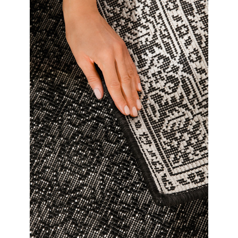 Moderní běhoun Duet v kontrastní kombinaci černé a bílé skvěle doplní chodbu, kuchyň nebo jiný úzký prostor, a díky své odolnosti se hodí i na kryté venkovní terasy. Stylový a praktický doplněk, který dodá vašemu domovu šmrnc.