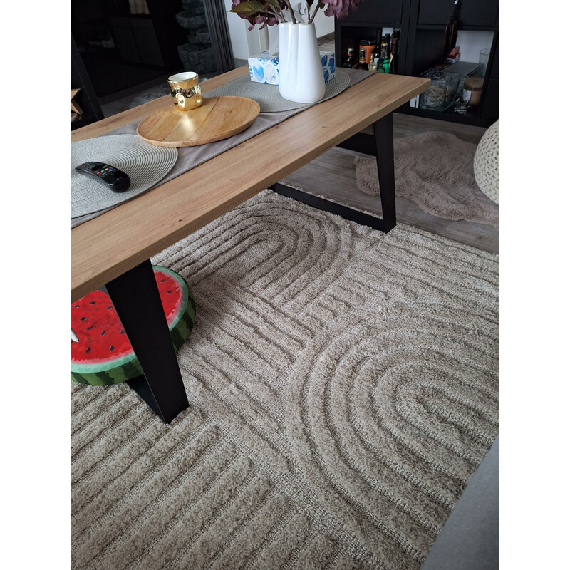 Kusový koberec v elegantní béžové barvě je skvělou volbou pro každý interiér. Polypropylenová vlákna zaručují praktickou údržbu a vysokou odolnost i v rušném domácím provozu. Spodní vrstva z juty zabraňuje posunu koberce po podlaze. Hodí se zejména do obývací pokoj, kde vynikne jeho styl a funkčnost.