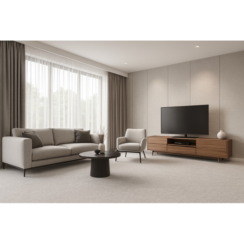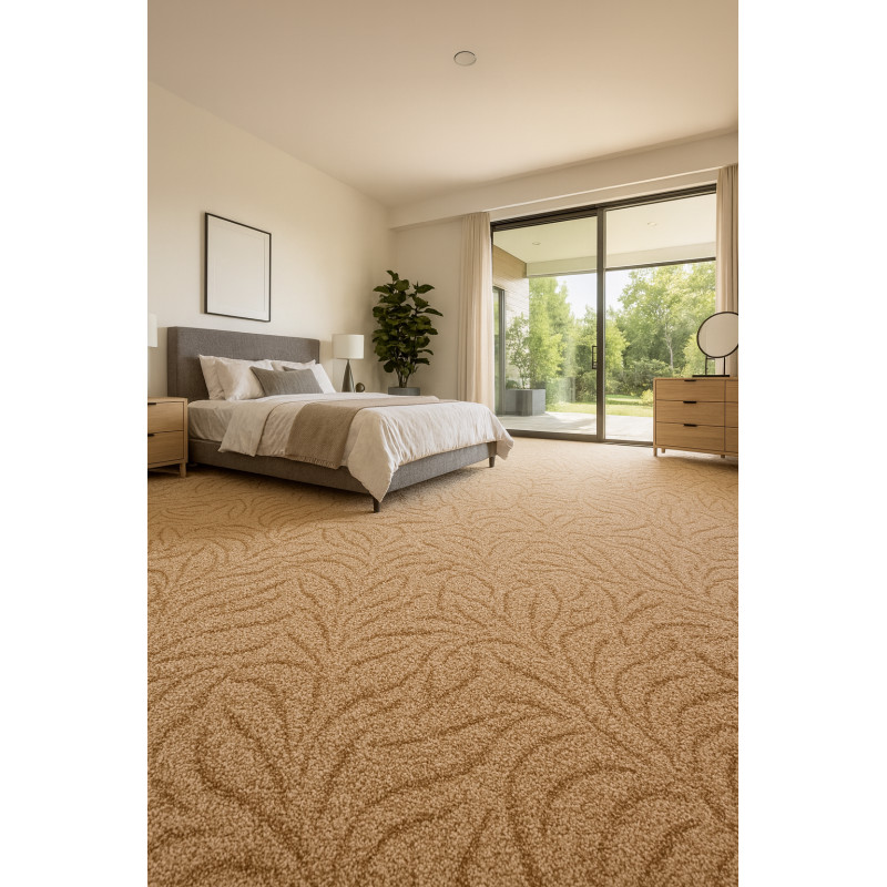 Béžový metrážový koberec, který se díky krátkému smyčkovému vlasu z polypropylenu vyznačuje vysokou odolností. Mezi jeho další přednosti patří snadná údržba, útlum kročejového hluku či kompatibilita s podlahovým topením.