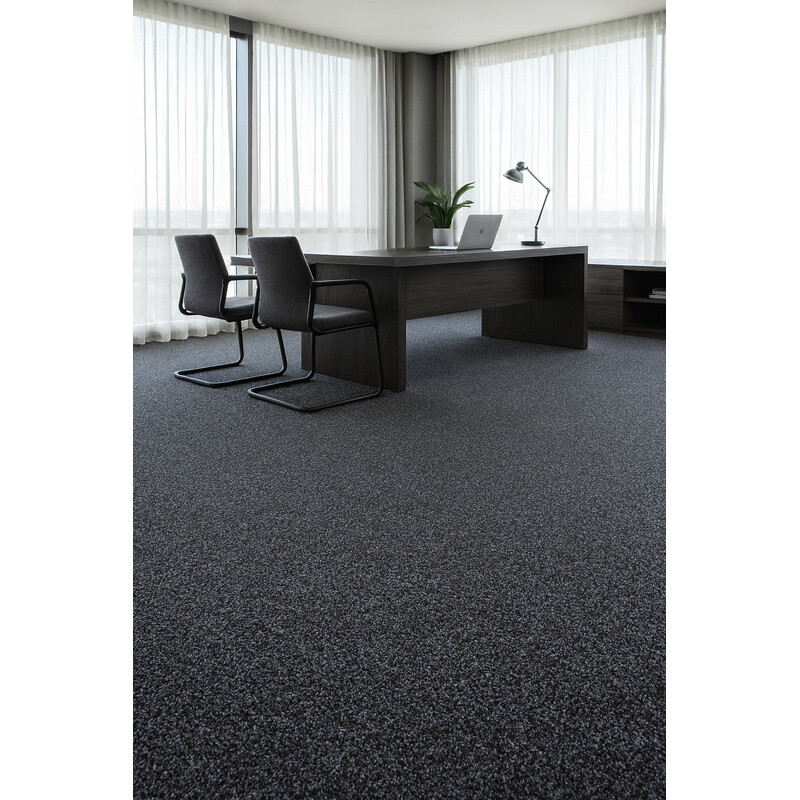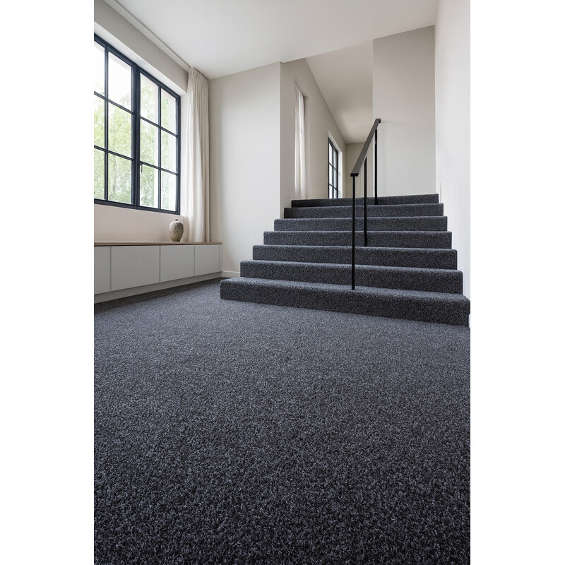 Tmavě šedý bytový koberec, který se může pyšnit dobrou kvalitou a praktickými vlastnostmi. Díky zesílenému filcovému podkladu má skvělé izolační vlastnosti. Je vyroben z pevného polypropylenu a má krátký smyčkový vlas. Proto je odolný a kompatibilní s kolečkovou židlí.