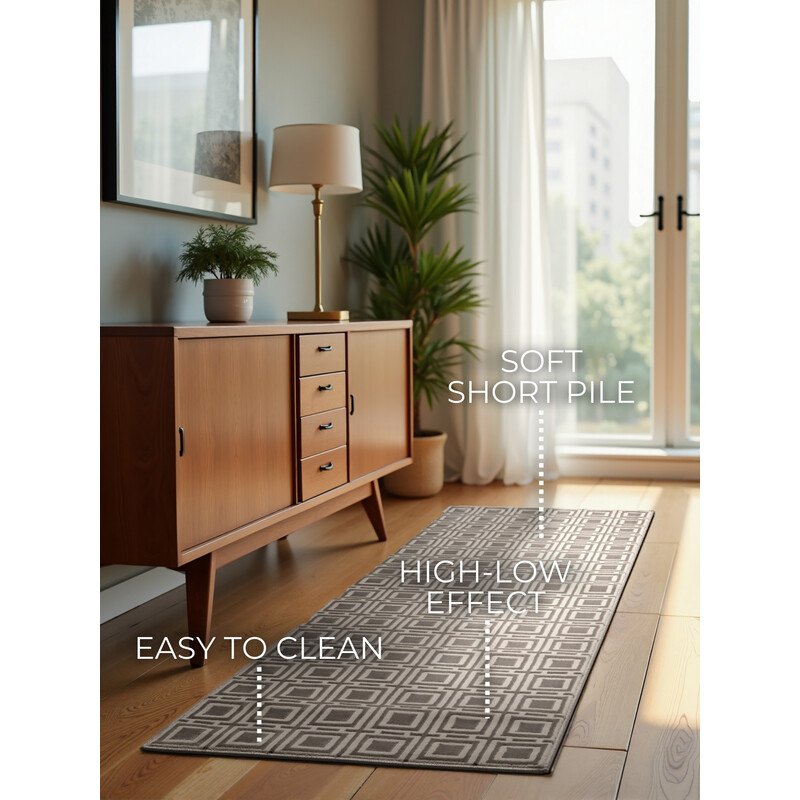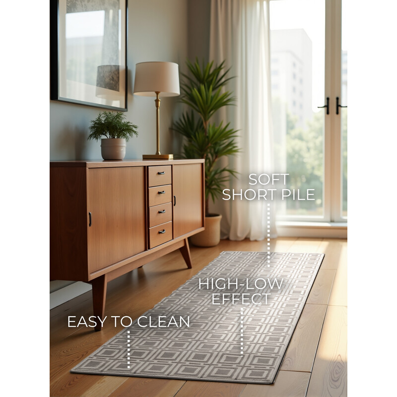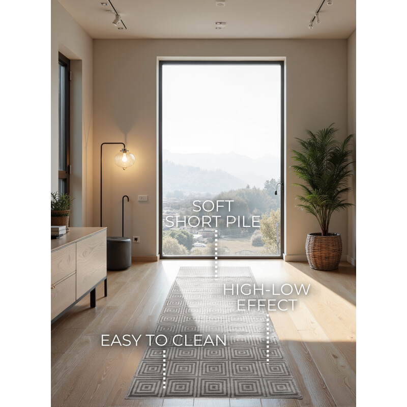 Běhoun v kombinaci krémově bílé a šedé barvy zaujme na první pohled svým originálním geometrickým motivem, který vnese do každého prostoru moderní nádech. Díky své neutrální barevnosti se snadno přizpůsobí různým stylům interiéru a elegantně doplní obývací pokoj či ložnici. Střižený vlas je příjemný na dotek, což z něj dělá nejen stylový, ale i praktický...