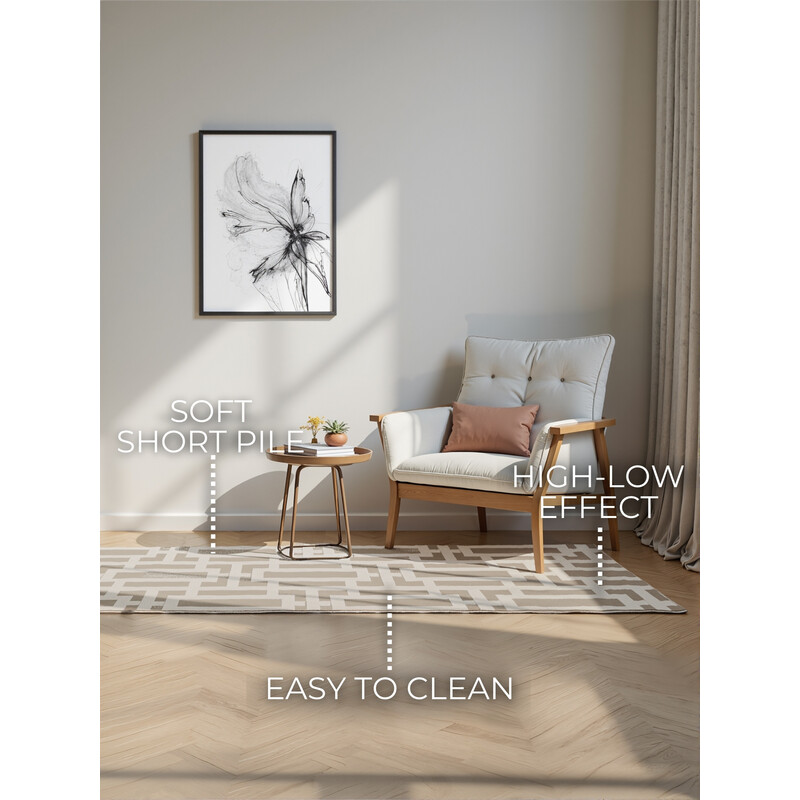 Moderní koberec s geometrickými tvary kombinující béžovou, hnědou a šedou barvu. Vyrábí se z kvalitního polypropylenu heatset frisé, což je speciálně upravený materiál zajišťující vysokou odolnost, hebký dotek a delší životnost. Koberec skvěle poslouží v každé domácnosti a nejlépe se hodí do obývacího pokoje nebo ložnice.