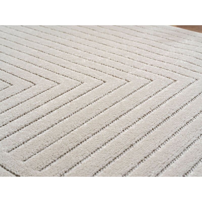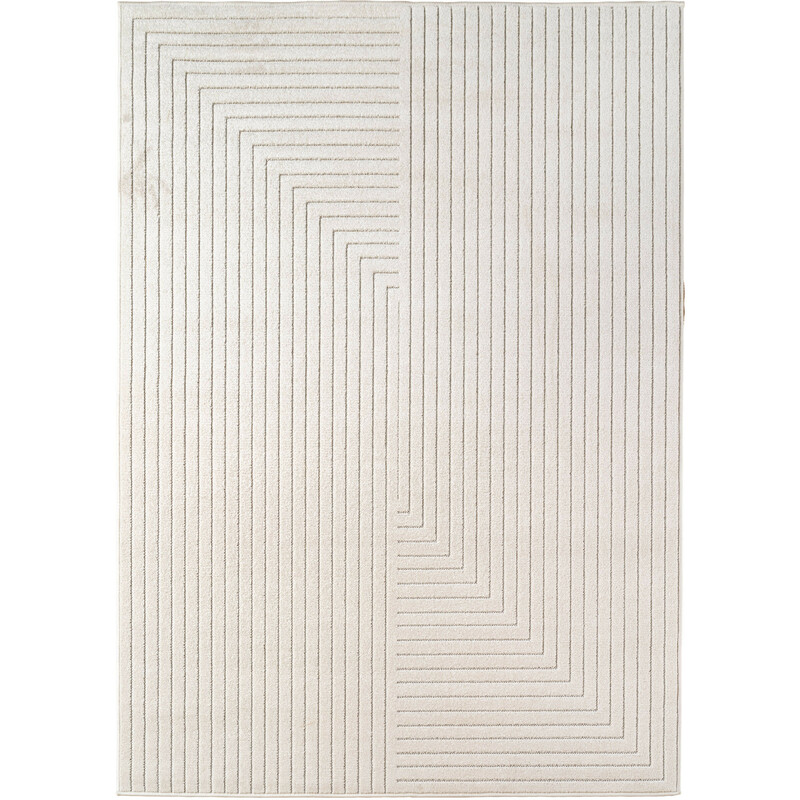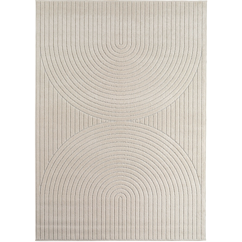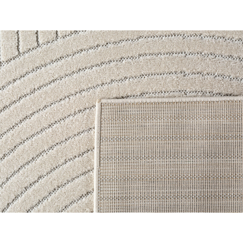 Krémový kruhový koberec ve skandinávském stylu s 3D geometrickým motivem. Ten vzniká díky kombinaci středně vysokých smyček a vyššího střiženého vlasu. Je vyroben z polypropylenu heatset, což je odolný a zároveň příjemný materiál. Koberec je proto měkký na dotek a nejlépe se hodí do obývacího pokoje nebo ložnice.