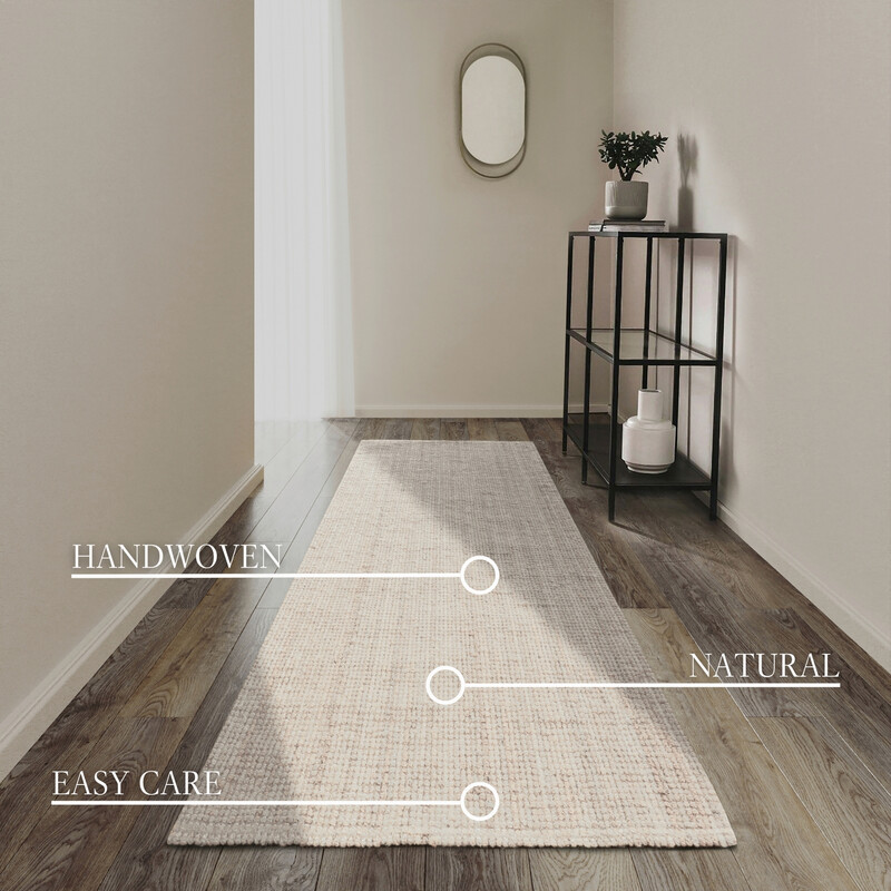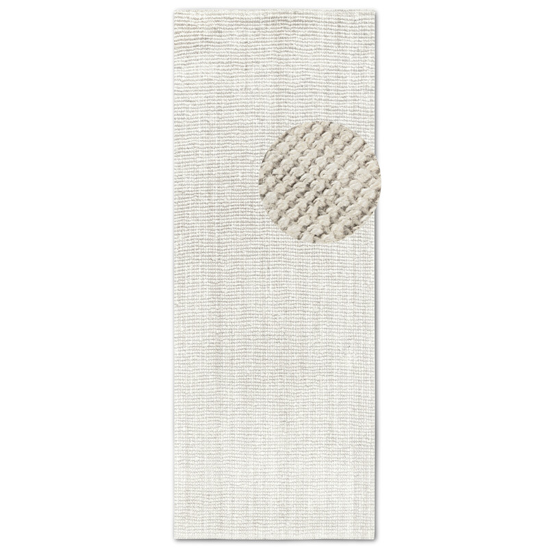 Ručně tkaný běhoun v krémově bílém odstínu s jemným melírováním přinese do interiéru svěží eleganci a nadčasový šarm. Jeho přírodní vzhled je podpořen pečlivě zpracovanou kombinací juty, vlny a bavlny, která vytváří odolný povrch. Díky nízkému vlasu typu bouclé je koberec nenáročný na údržbu a dokonale zapadne do moderních i klasických prostor.