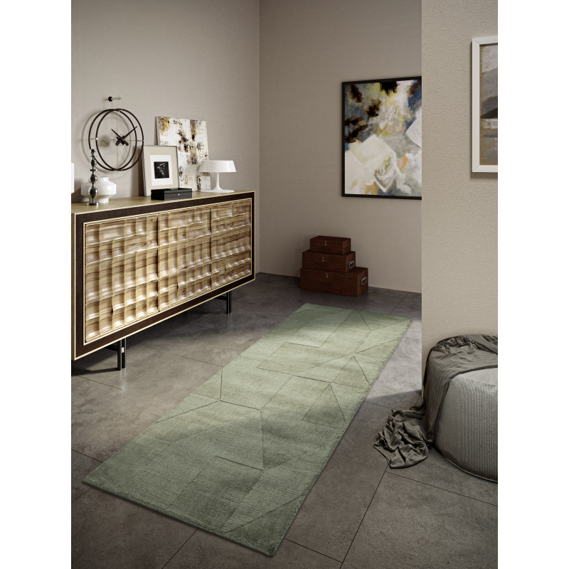 Běhoun přináší atraktivní kombinaci mátově zelené barvy a různých odstínů šedé, která osvěží každý interiér. Geometrický vzor s ručně vyřezávanými obrysy tvarů vytváří zajímavý 3D efekt. Krátký vlas zaručuje snadnou údržbu, což ocení především rodiny s malými dětmi nebo domácími mazlíčky. Polypropylen koberci poskytuje vysokou odolnost a příjemný komfort.