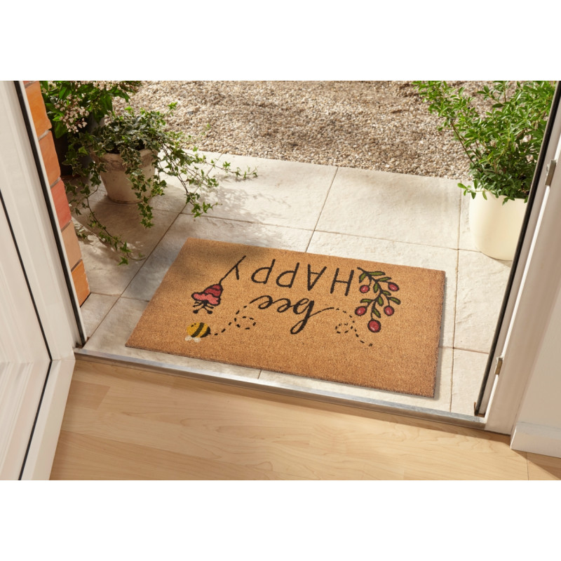 Rohožka s motivem včeličky poletující kolem květin přinese do vašeho domova nádech přírody a veselou atmosféru. Je vyrobena ze 100% kokosového vlákna, takže účinně odstraňuje nečistoty z obuvi. Spodní strana z PVC zajišťuje stabilitu na podlaze. Údržba je snadná – rohožku stačí vyklepat nebo vysát.