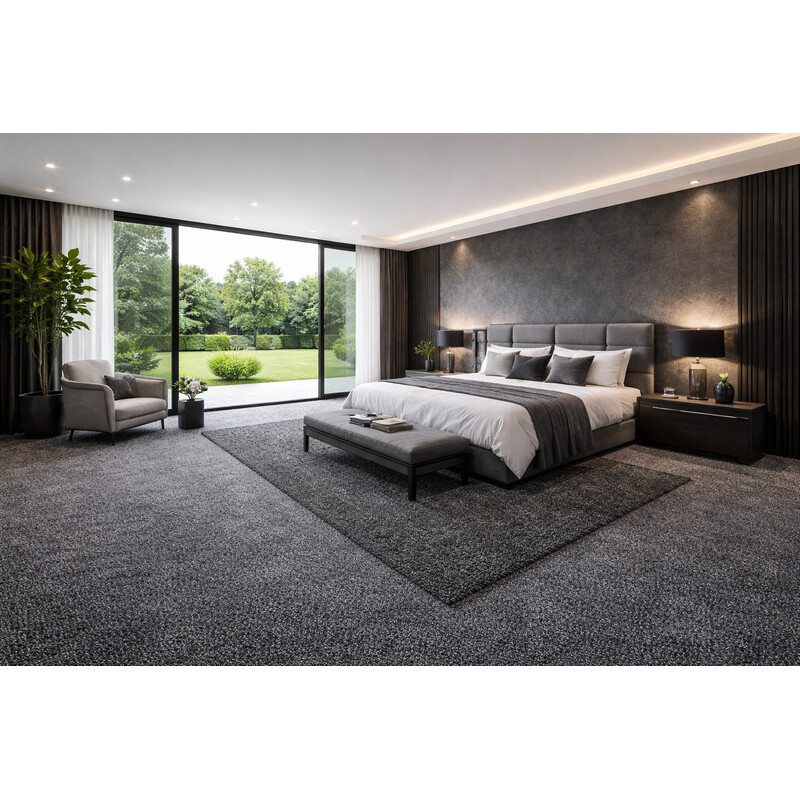 Tmavě šedý koberec v metráži můžete položit do místností i na silně zatížená schodiště. Díky krátkému smyčkovému vlasu z polyamidu je totiž velmi odolný. O tom vypovídá i fakt, že při pojezdu kolečkovou židlí není potřeba podložka, a to ani v případě tvrdých koleček. Koberec je vhodný i pro alergiky.