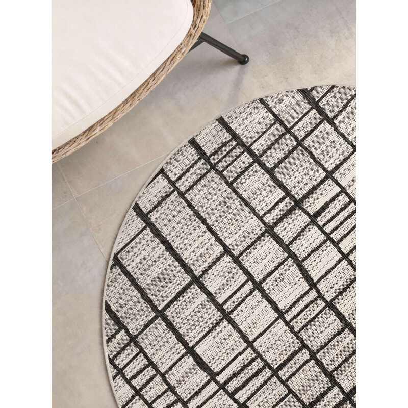 Bounds v kruhové podobě z kolekce Haringey je černobílý solitér s grafickým vzorem, který přitáhne oči i objektivy návštěv. Hodí se na terasu i do obýváku, oboustranný design vám dá dva looky v jednom kuse. Polypropylen v ploché vazbě, vhodný uvnitř i venku, vyroben v Evropě a postavený na vytrvalost.
