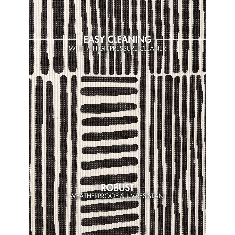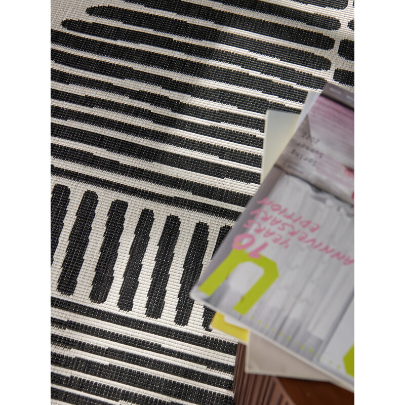Dorothy z kolekce Haringey je černobílý kus s decentním grafickým vzorem, který sluší minimalismu i víc oblečenějším interiérům. Plochá polypropylenová vazba je odolná, oboustranná a má rychlý reset přes pračku zahradní hadicí. Vhodná dovnitř i ven, vyrobená v Evropě a v provedení, které stárne pomalu a dobře.