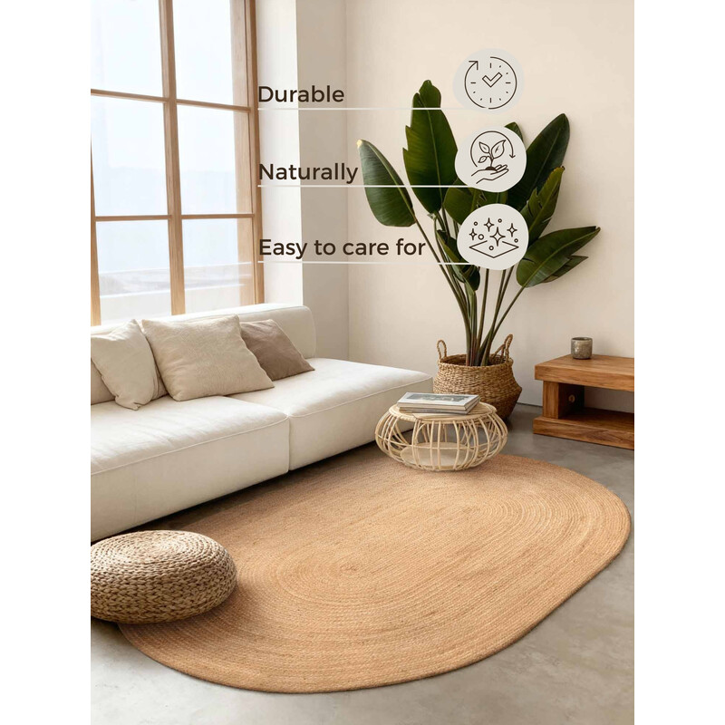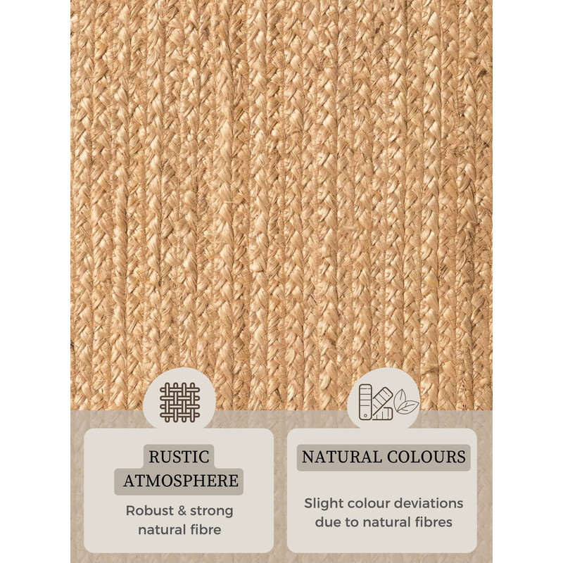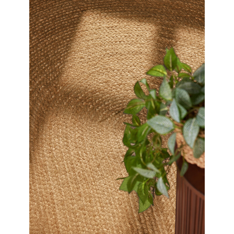 Tento přírodní koberec ze 100% juty zaujme svým rustikálním pleteným vzorem, který přidá vašemu interiéru hřejivý a útulný nádech, i neobvyklým tvarem. Juta je velmi odolný materiál, který snadno odpuzuje prach a nečistoty. Díky svému ekologickému složení je koberec šetrný k životnímu prostředí i zdraví.