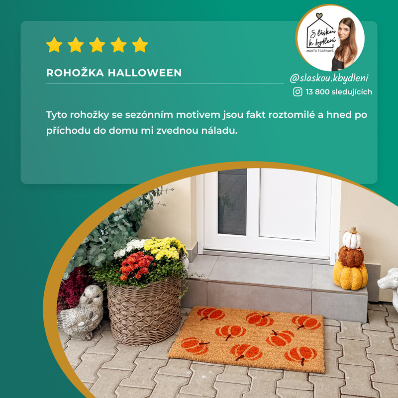 Rohožka s oranžovými dýněmi připomíná podzimní období, kdy se na Halloween dlabají dýně a chodí se koledovat. Venkovní dveře samozřejmě může zdobit celoročně a můžete si být jisti, že Vám perfektně očistí boty kdykoliv budete potřebovat. Má totiž vysoký vlas z hrubého kokosového vlákna.