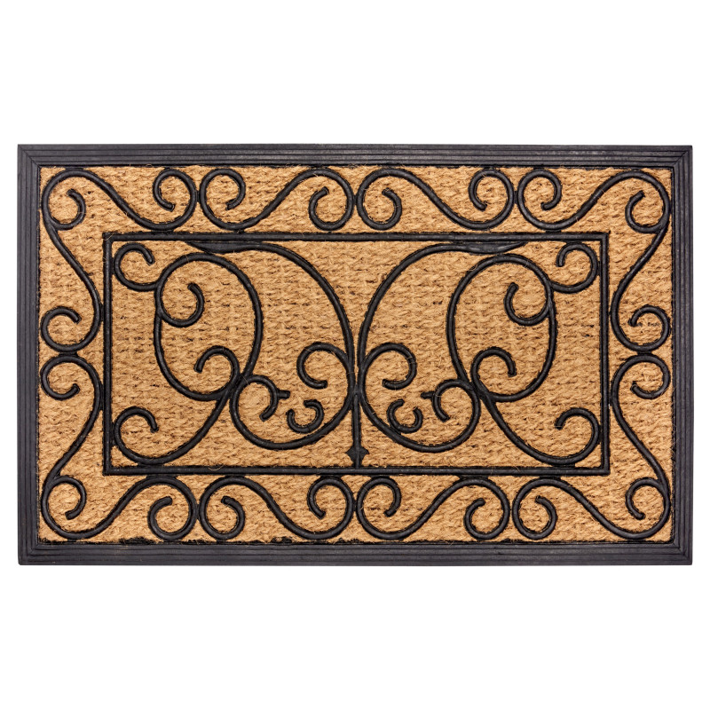 Obdélníková rohožka z kokosového vlákna zdobená gumovými ornamenty je stylový a praktický doplněk pro každý vchod. Díky pevnému kokosovému materiálu efektivně zachytává nečistoty a vlhkost z obuvi, což pomáhá udržovat čistotu v interiéru. Hodí se k domovním dveřím, na terasy nebo do vstupních hal.