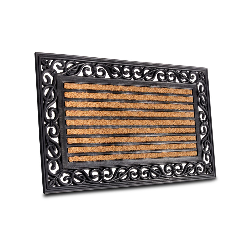 Tato rohožka s pruhy z kokosového vlákna uprostřed a gumovým zdobením po obvodu je stylovým a praktickým doplňkem do vašeho domova. Přírodní kokosové vlákno účinně zachycuje nečistoty z obuvi, zatímco gumový okraj s dekorativními vzory zajišťuje elegantní vzhled a vysokou odolnost. Protiskluzový gumový podklad poskytuje stabilitu na různých površích....