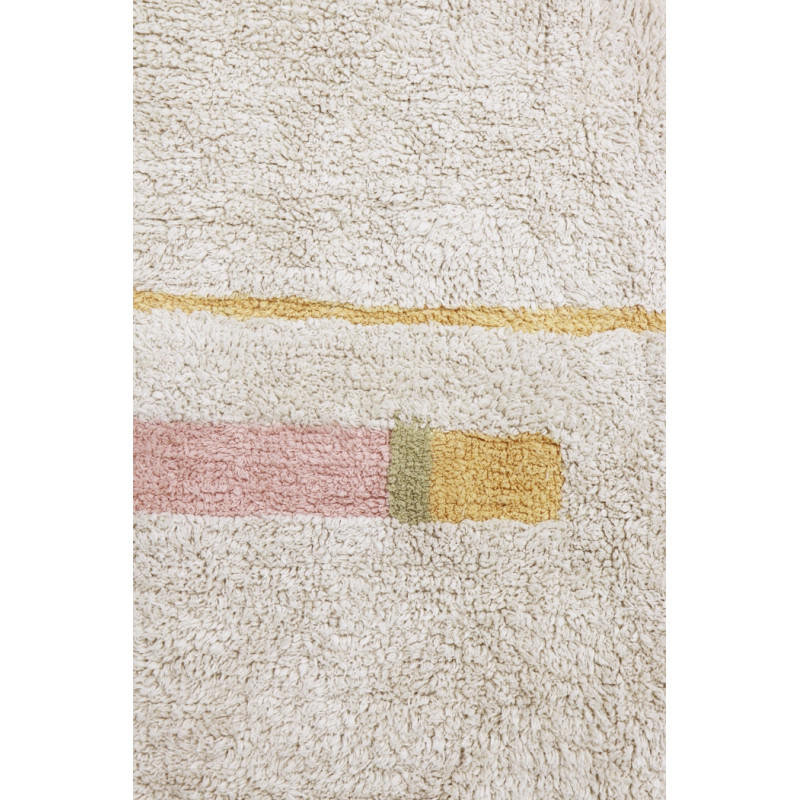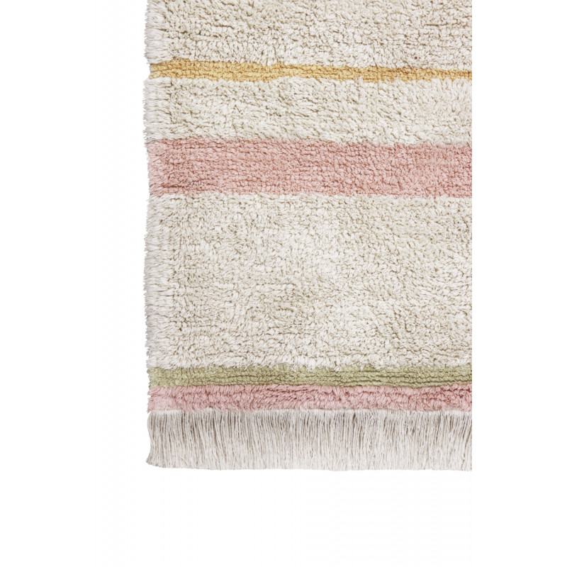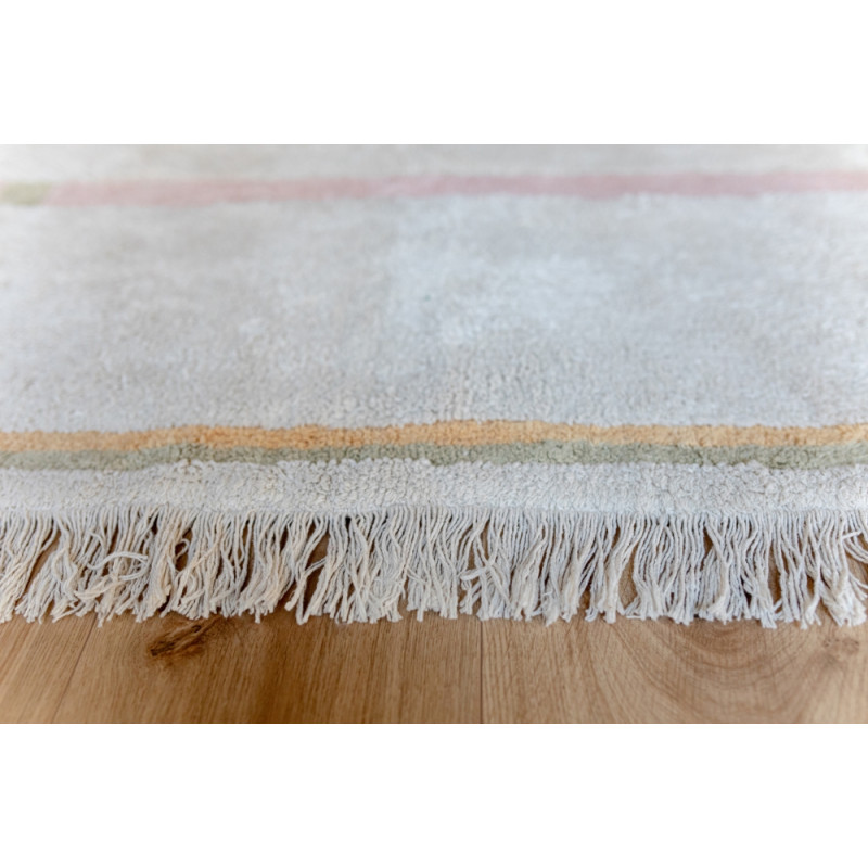 Pratelný koberec kombinující krémově bílou barvu s pastelovými proužky. Vyrábí se z přírodní bavlny a má plastický motiv. Třásně na kratších stranách mu dodávají šmrnc. Nemusíte se bát, že světlý koberec nenávratně ušpiníte, protože ho můžete v případě potřeby vyprat v pračce. Ideální volba do obývacího pokoje k pohovce nebo do ložnice k posteli.