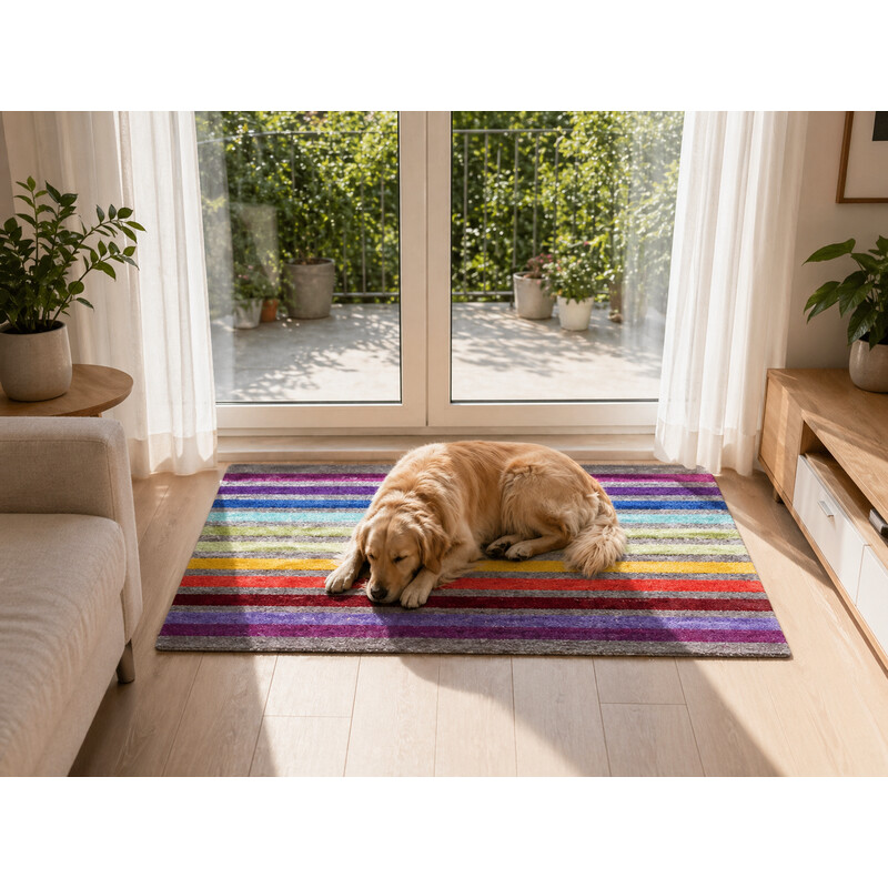Pruhovaný běhoun, který byl za využití syntetického polyesteru a přírodní bavlny vyroben v Egyptě. Jedná se o praktický běhoun s protiskluzovým podkladem, který se díky krátkému smyčkovému vlasu také snadno čistí. Ideální pro Vašeho chlupatého parťáka jako podložka pod misky nebo kobereček, který vytvoří místo na ležení.