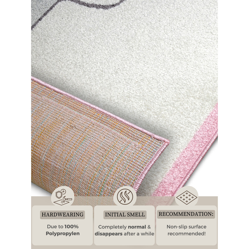 Růžový kruhový koberec, zdobený červenými, šedými a bílými srdíčky, přinese do dětského pokoje nádech hravosti. Vyroben ze 100% polypropylenového vlákna je nejen odolný, ale i měkký na dotek. Střižený vlas střední výšky zajišťuje pohodlí, zatímco obšití po obvodu prodlužuje jeho životnost.