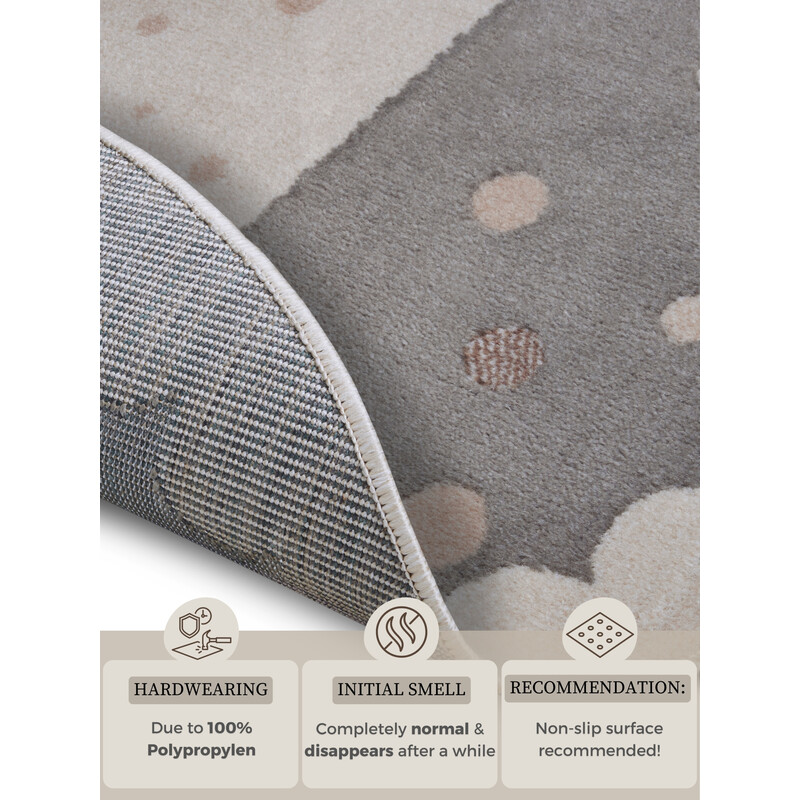 Krémově bílý kruhový koberec s šedým medvídkem je ideálním doplňkem do dětského pokoje, který vnese do prostoru klid a roztomilost. Měkoučký koberec ze 100% polypropylenového vlákna je velmi příjemný na dotek a díky středně vysokému střiženému vlasu poskytuje pohodlí při hraní. Je obšitý po celém obvodu, což zajišťuje jeho odolnost. Antistatická úprava...