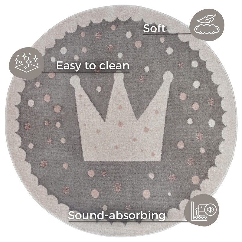Šedý kruhový koberec s krémově bílou korunkou uprostřed a jemnými růžovými puntíky přinese do dětského pokoje nádech královského stylu. Je vyroben ze 100% polypropylenového vlákna, které zaručuje vysokou odolnost i při častém používání, a jeho středně vysoký střižený vlas je příjemný na dotek. Koberec je navíc obšitý po celém obvodu, což prodlužuje jeho...