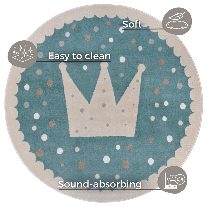 Modrý kruhový koberec s krémově bílou korunkou uprostřed je stylovým a praktickým doplňkem každého dětského pokoje. Je vyroben ze 100% polypropylenového vlákna, které je nejen měkké, ale také odolné, což zaručuje dlouhou životnost i při častém používání. Navíc středně vysoký střižený vlas poskytuje příjemný povrch na hraní.