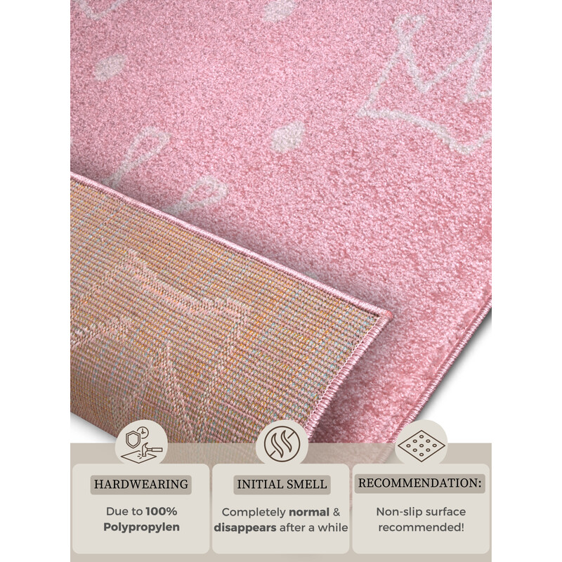 Růžový koberec s roztomilými korunkami a puntíky vnese do dětského pokoje kouzelnou atmosféru. je vyrobený ze 100% polypropylenového vlákna, takže je měkký, odolný a ideální pro každodenní hry. Středně vysoký střižený vlas dodává pohodlí a díky snadné údržbě, kterou zvládnete kobercovým šampónem nebo pěnou, zůstane krásný a svěží i po dlouhodobém používání.