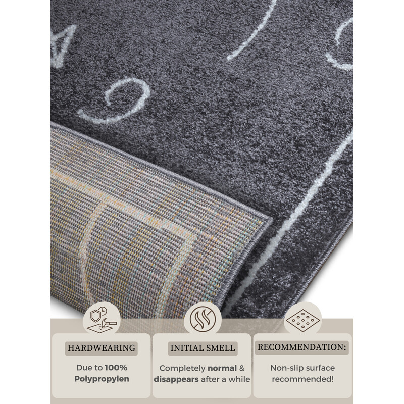 Šedý koberec s motivem fotbalového hřiště a strategickými poznámkami od trenéra je perfektní pro malé sportovce. Je vyroben ze 100% polypropylenového vlákna, takže je nejen odolný, ale i příjemný na dotek. Střižený vlas střední výšky zajišťuje pohodlí při hře a obšití po celém obvodu zvyšuje jeho trvanlivost.