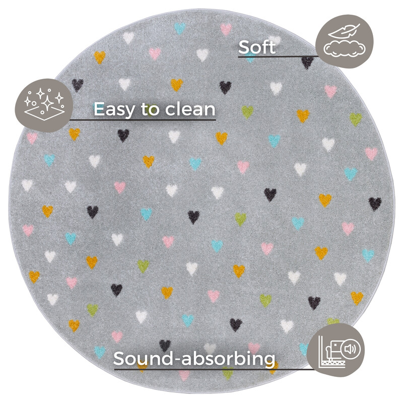 Šedý kruhový koberec s různobarevnými srdíčky přinese hravost do každého dětského pokoje. Měkký, ale odolný povrch ze 100% polypropylenového vlákna je ideální pro každodenní hraní. Středně vysoký střižený vlas zajišťuje pohodlí, zatímco obšití po obvodu prodlužuje jeho životnost.