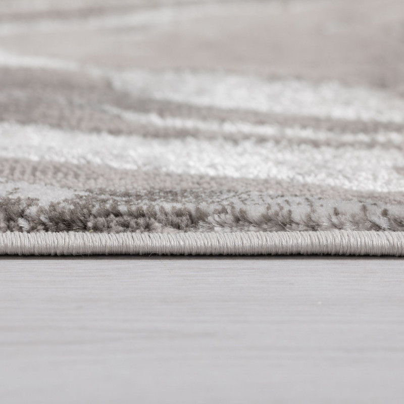 Šedý kruhový koberec s melírovaným základem je protkaný křivkami, které vytvářejí kosočtverce a lichoběžníky. Povedený geometrický motiv má navíc 3D efekt díky kombinaci středně vysokých smyček a vyššího střiženého vlasu. Polypropylen heatset, ze kterého je koberec vyroben, zajišťuje odolnost a příjemný povrch.