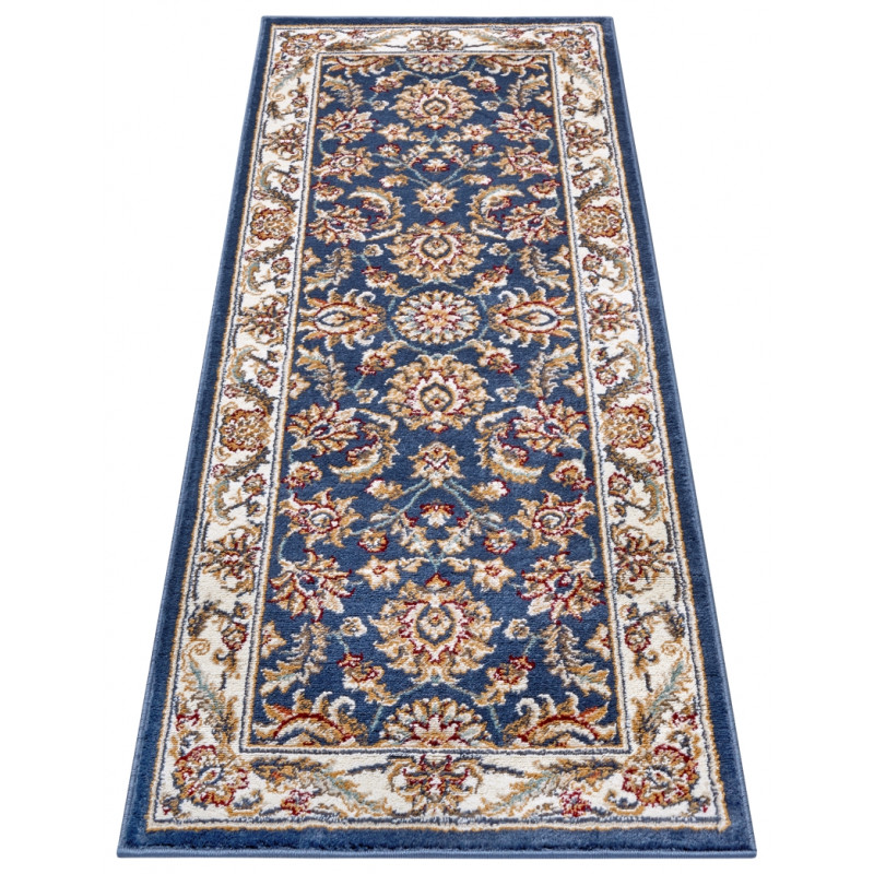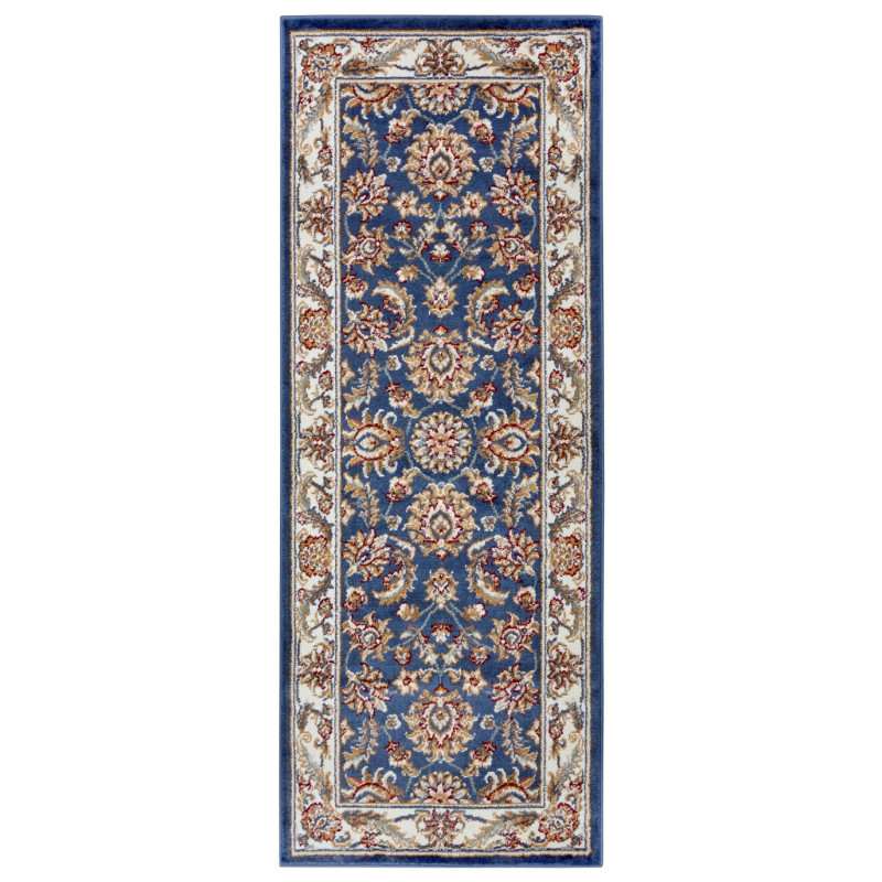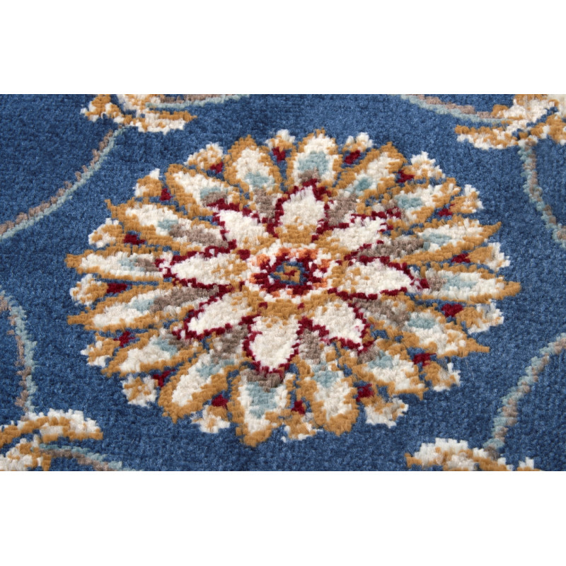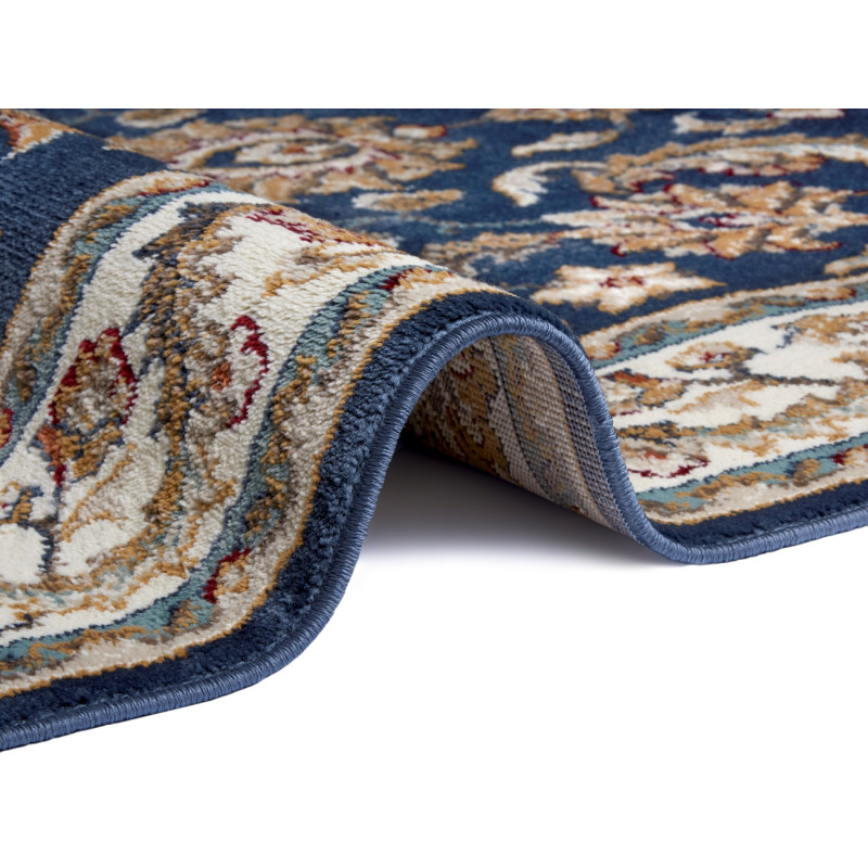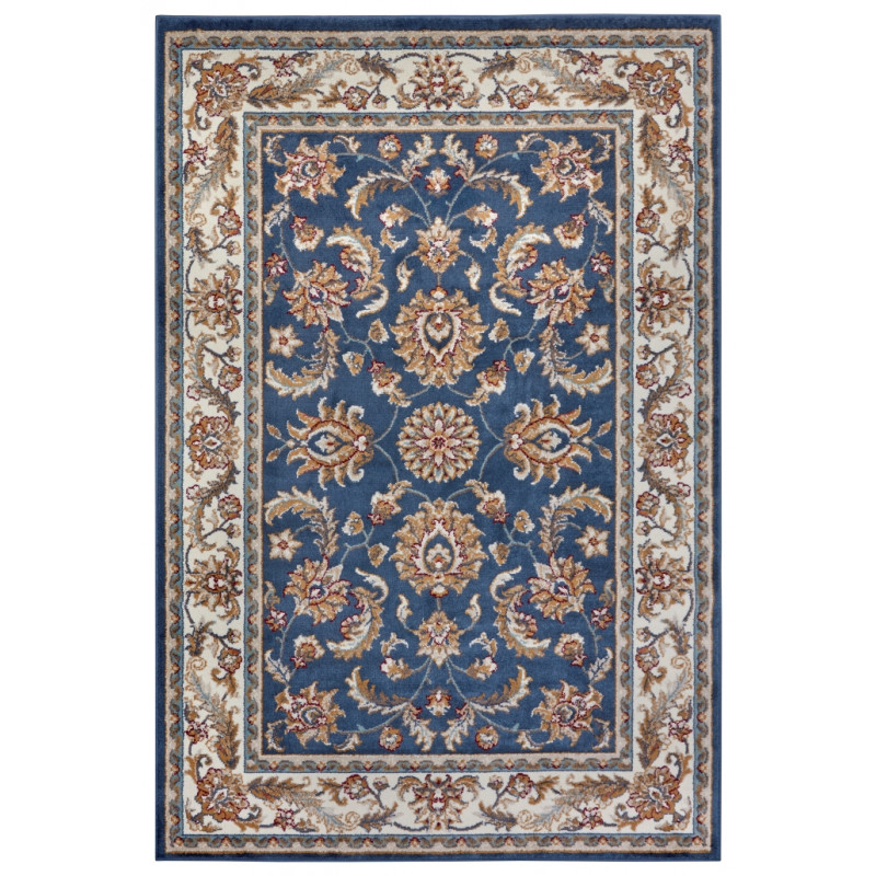 Orientální koberec s tmavě modrým středem a krémově bílými okraji je ozdoben různorodými a různobarevnými tvary. Kromě poutavého motivu je jeho předností i měkký a komfortní povrch. Koberec se proto nejlépe hodí do obývacího pokoje k pohovce nebo do ložnice k posteli.