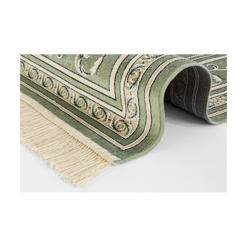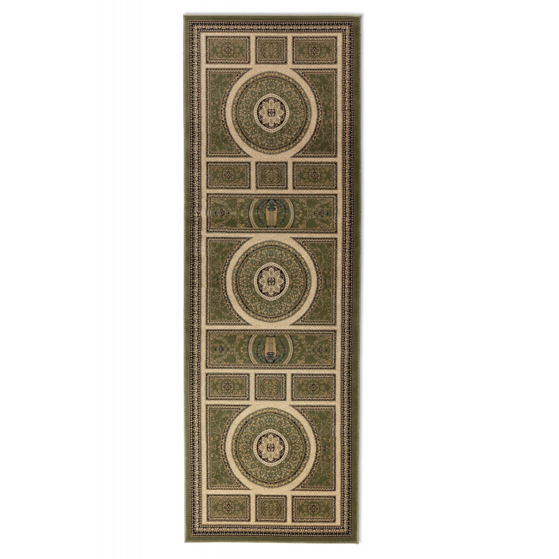 Olivově zelený běhoun s úžasným orientálním motivem, který připomíná mozaiku ze starověkého Říma, vnese do interiéru elegantní prvek. Precizní detaily vzoru vytvářejí dojem tradičního řemeslného umění, které okamžitě zaujme. Koberec je vyroben z odolného materiálu, který zajišťuje jeho dlouhou životnost a snadnou údržbu díky krátkému střiženému vlasu.