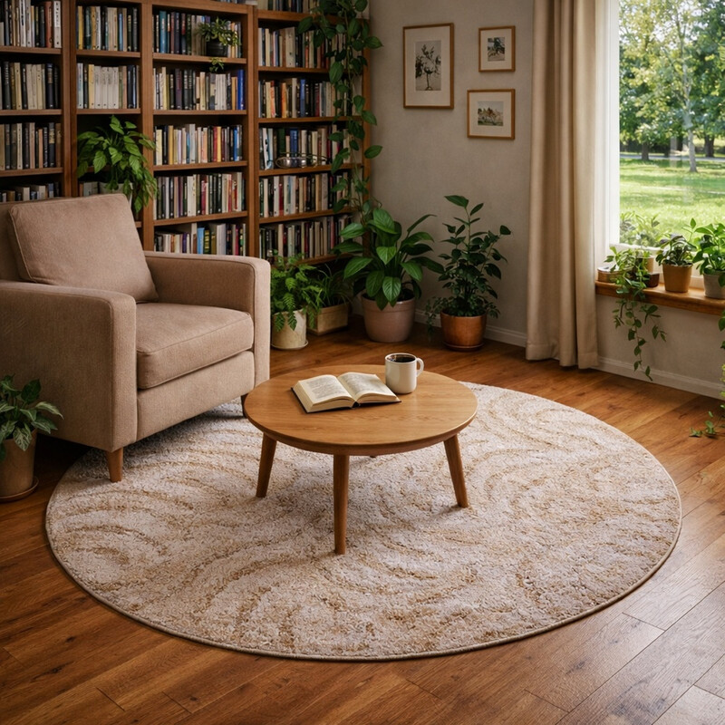 Kruhový koberec Scroll v elegantní béžové barvě přináší do interiéru harmonii a nadčasovost. Béžová je univerzální odstín, který se skvěle hodí do jakéhokoliv prostoru – snadno jej sladíte s moderním, minimalistickým i retro stylem. Tento světlý tón opticky zvětšuje místnost a zároveň ji činí útulnější, což oceníte zejména v obývacím pokoji nebo ložnici....