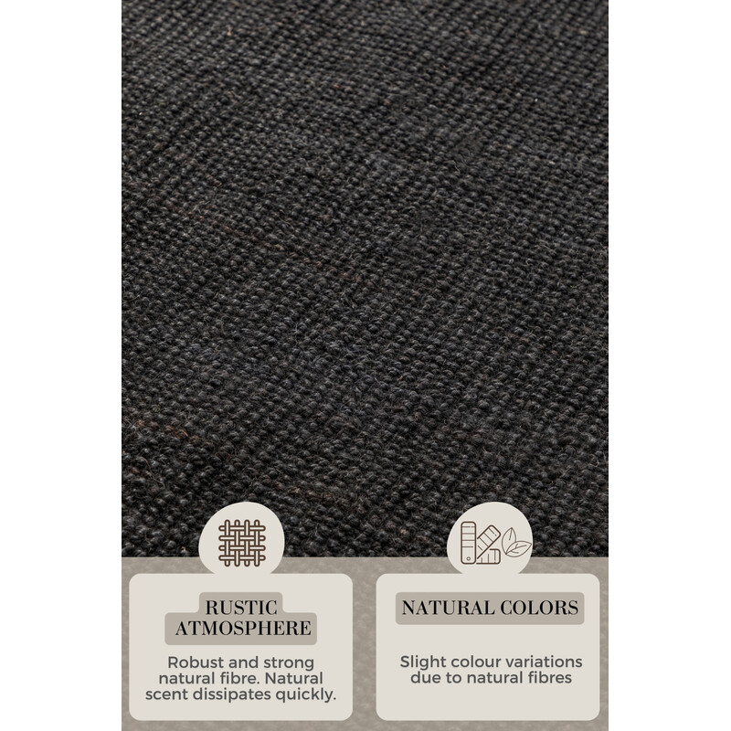 Koberec zaujme svým elegantním černým odstínem s jemným šedým nádechem, který dodává interiéru sofistikovaný a moderní vzhled. Díky bouclé struktuře je odolný a zároveň si zachovává minimalistický a přirozený charakter. Jeho decentní design umožňuje snadné začlenění do obývacího pokoje, ložnice nebo chodby.
