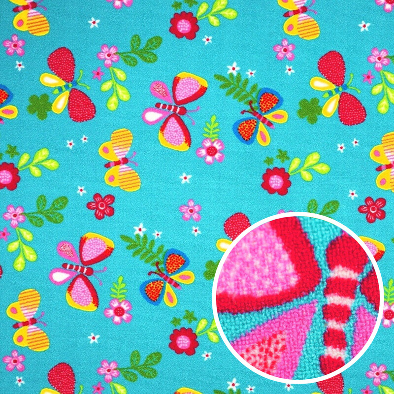 Dětský metrážový koberec Motýlek 5271 modrý s nádechem do tyrkysové barvy je velmi pestrý a poutavý. Díky svým vlastnostem se perfektně hodí do dětských pokojů, protože je odolný, snadný na údržbu, izoluje chlad, tlumí hluk a je kompatibilní s kolečkovou židlí.