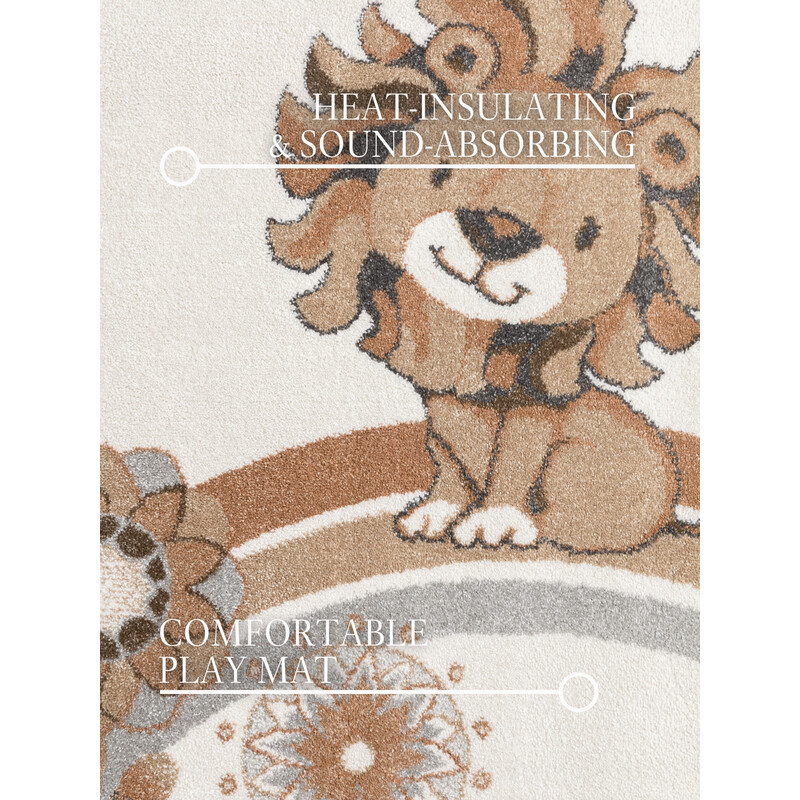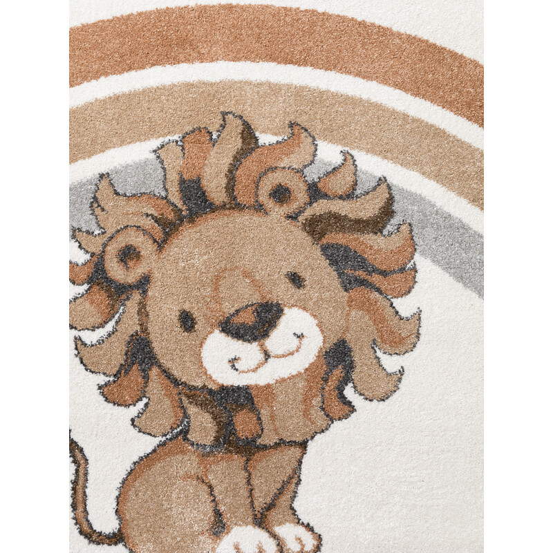 Krémově bílý koberec promění dětský pokoj v místo plné radosti a fantazie. Uprostřed duhy se pohodlně usadil usměvavý lev, zatímco jeho veselý kamarád opičák se mu houpe nad hlavou. Jemné pastelové odstíny a měkké linie působí hravě, ale zároveň uklidňují, takže koberec krásně zapadne do každého dětského koutku. Hebký povrch je ideální pro hraní i...