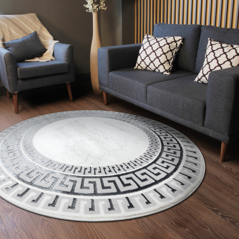 Tmavě šedý venkovní koberec v kruhovém provedení s výraznou smyčkovou strukturou. Středně vysoké smyčky jsou velmi pevné a spletené do jednotlivých copánků, které vypadají jako letokruhy. Vysokou odolnost podporuje i polypropylen, ze kterého je koberec vyroben. Další výhodou je snadná údržba nebo antistatická úprava.