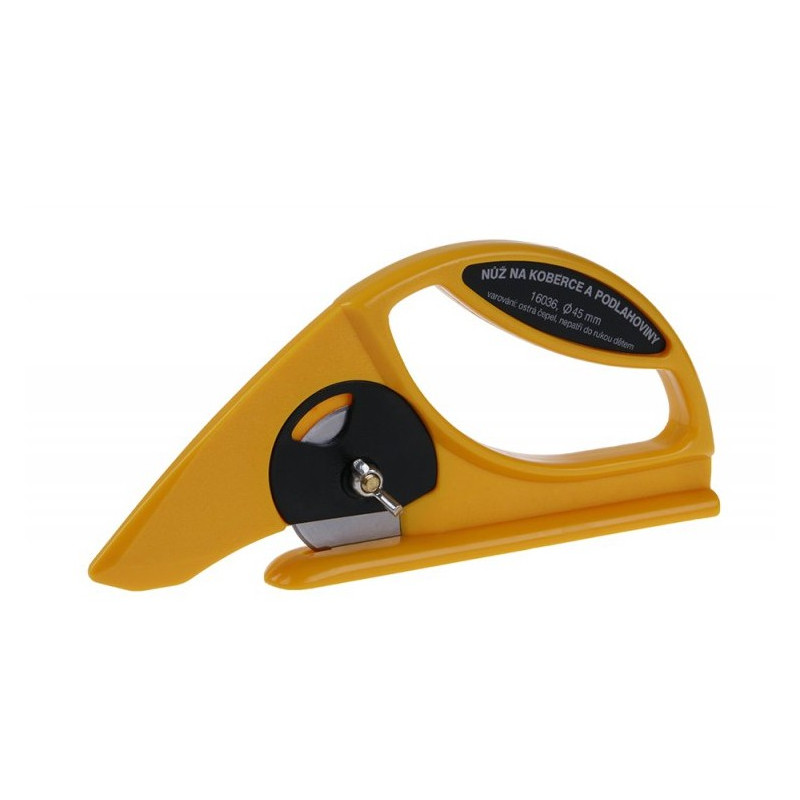 Velmi praktický a šikovný nůž s kotoučkovým řezákem na koberce, PVC podlahy - lino, který zejména oceníte u podlahovin z třepícího se materiálu. Nůž se skládá z pevného platového těla s praktickým úchopem a kotoučovým nožem, který se dá snadno vyměnit. Délka nože je 19 cm, výška 8,5 cm a průměr kotoučového řezáku je 45mm. Pozor, velmi ostrý nástroj!