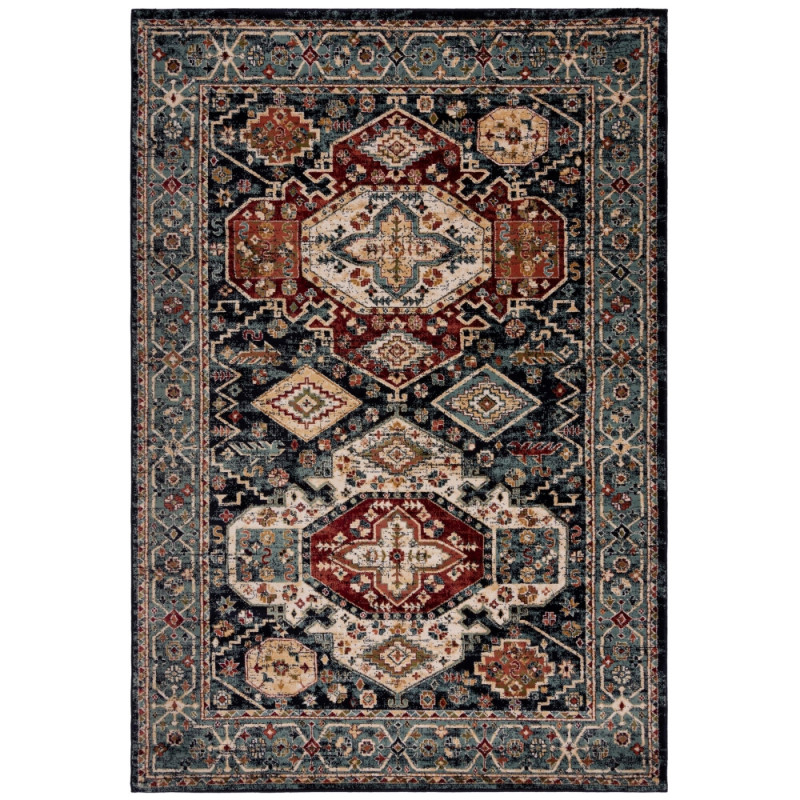 Modrý koberec s různobarevnými orientálními vzory přinese do interiéru živou atmosféru. Jeho design kombinuje tradiční motivy s moderním pojetím, což vytváří atraktivní kontrast. Je vyrobený ze 100% polypropylenu, a proto nabízí vysokou odolnost a snadnou údržbu.
