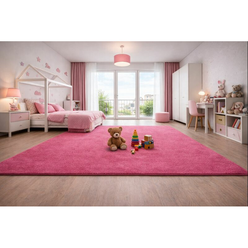 Světle růžový koberec s huňatým vlasem udělá parádu například v dívčím pokoji nebo v romanticky laděné ložnici či obýváku. Má velmi příjemný a měkký povrch, a proto se nejlépe hodí tam, kde chodíte naboso. Vyrábí se z polypropylenu frisé, což je kvalitní a odolný materiál zajišťující dlouhou životnost a komfort.