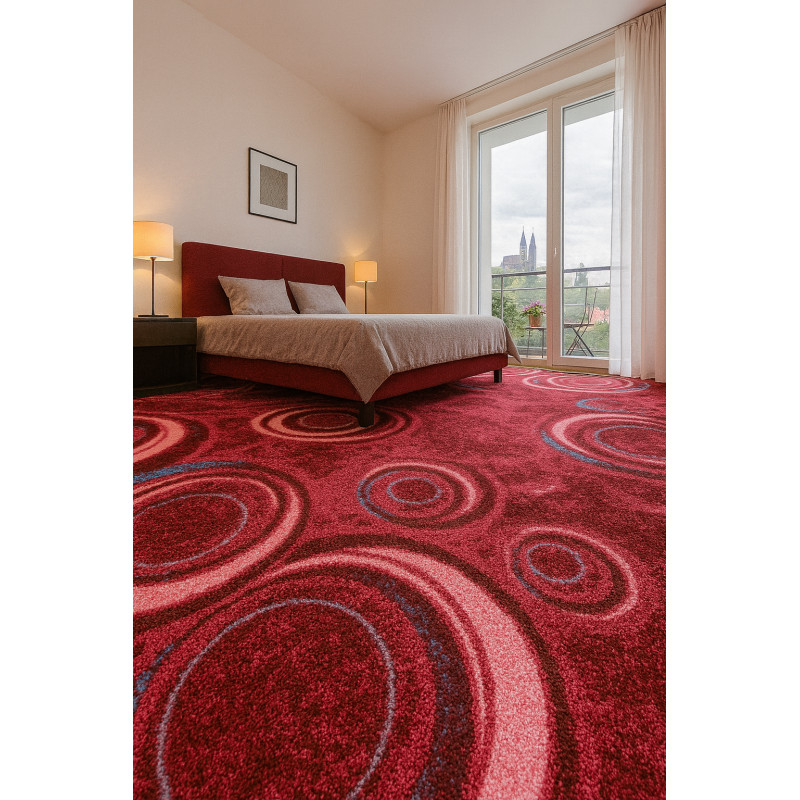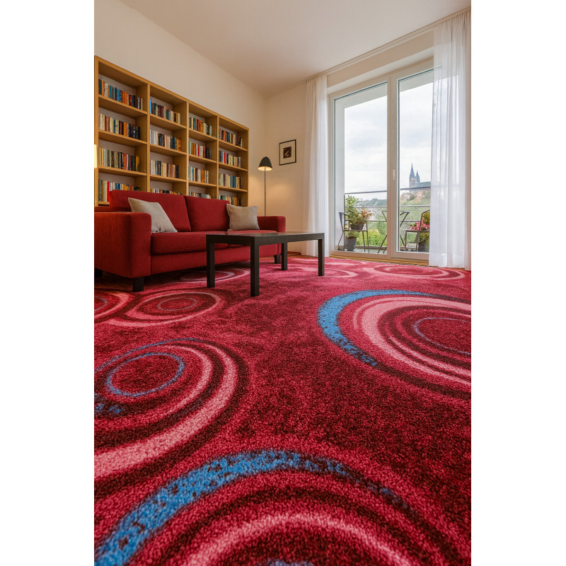 Velice moderní kusový koberec z kolekce Drops v červené barvě. Koberec je cenově velice přijatelný a hodí se především do středně namáhaných bytových prostor. Zdobený je potiskem v podobě barevných kruhů. Koberec se velice dobře čistí a můžete ho použít na podlahové vytápění.