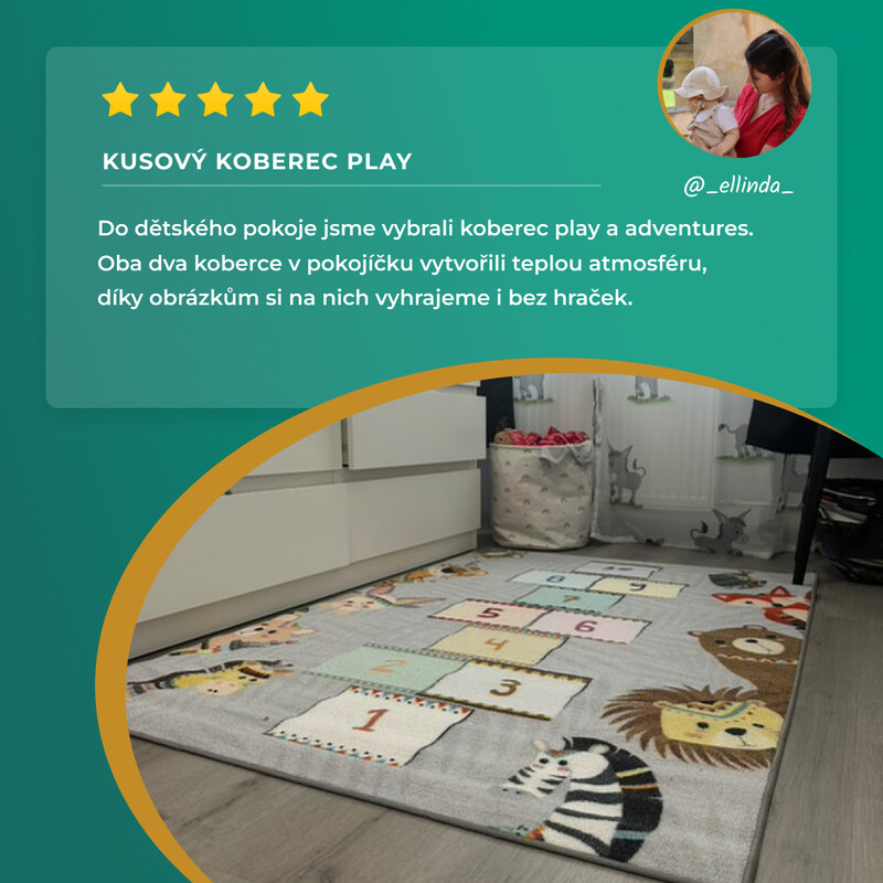 Kusový koberec Play 2903 grey je ideální doplněk do dětského pokoje. Jednak budou mít děti v pokojíčku malou zoologickou zahradu a navíc se mohou zabavit při skákání panáka. Koberec je vyroben z polyamidu, a díky tomu je odolný, snadný na údržbu a za nízkou cenu.