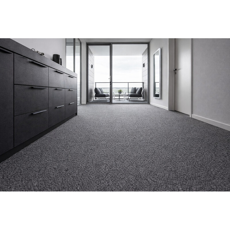 Tmavě šedý metrážový koberec je velmi praktický. Jednak díky své barvě ladí k jakémukoliv nábytku a navíc úspěšně skryje drobné nečistoty. Je vyroben ze 100% polypropylenu a má krátký vlas. Díky těmto parametrům je odolný a snadný na údržbu.