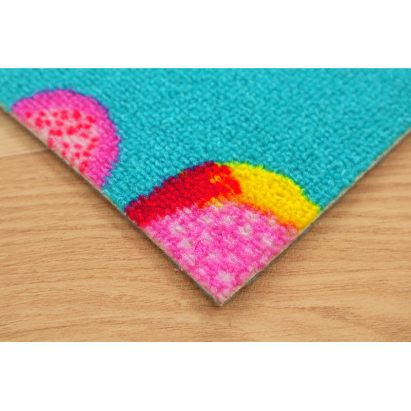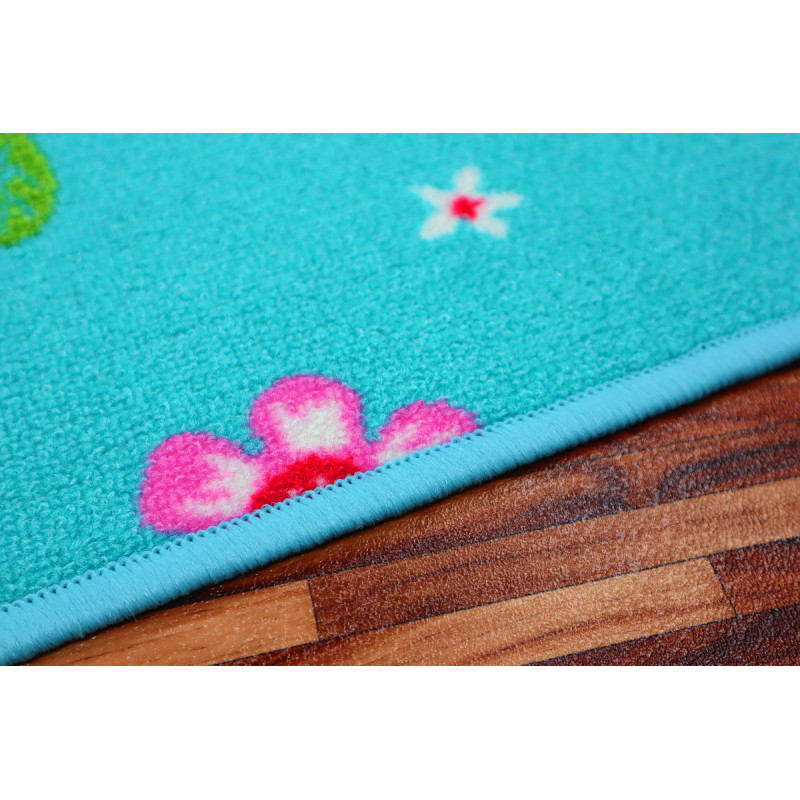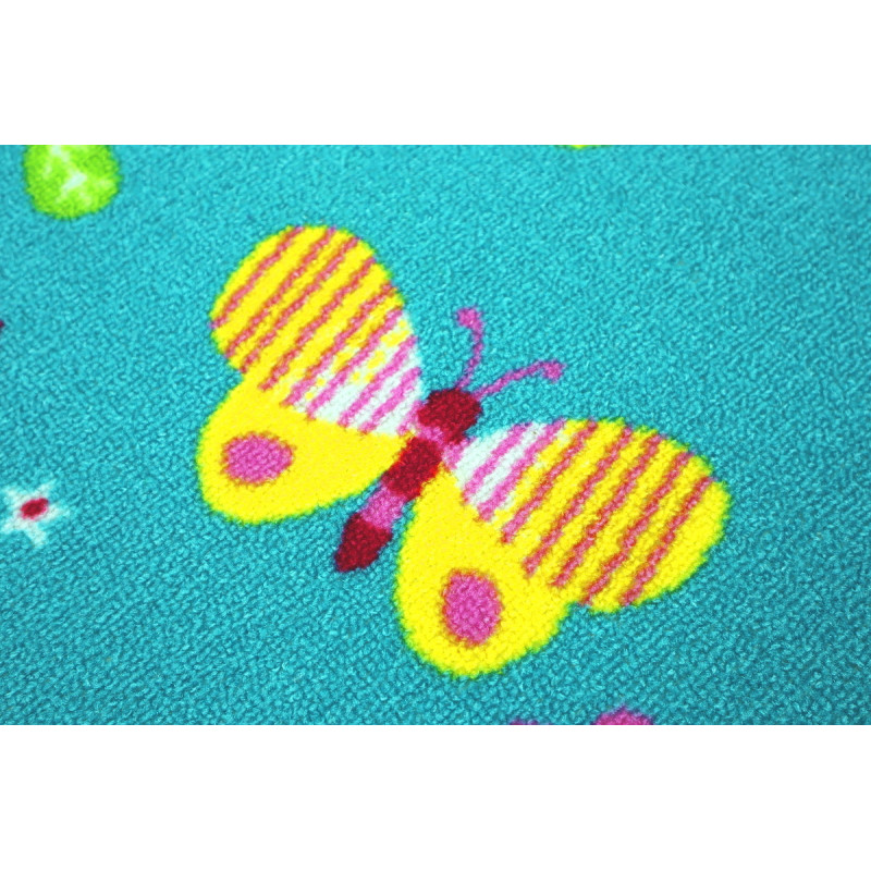 Dětský metrážový koberec Motýlek 5271 modrý s nádechem do tyrkysové barvy je velmi pestrý a poutavý. Díky svým vlastnostem se perfektně hodí do dětských pokojů, protože je odolný, snadný na údržbu, izoluje chlad, tlumí hluk a je kompatibilní s kolečkovou židlí.