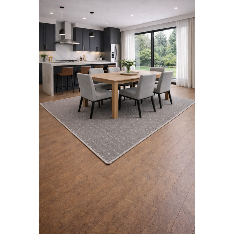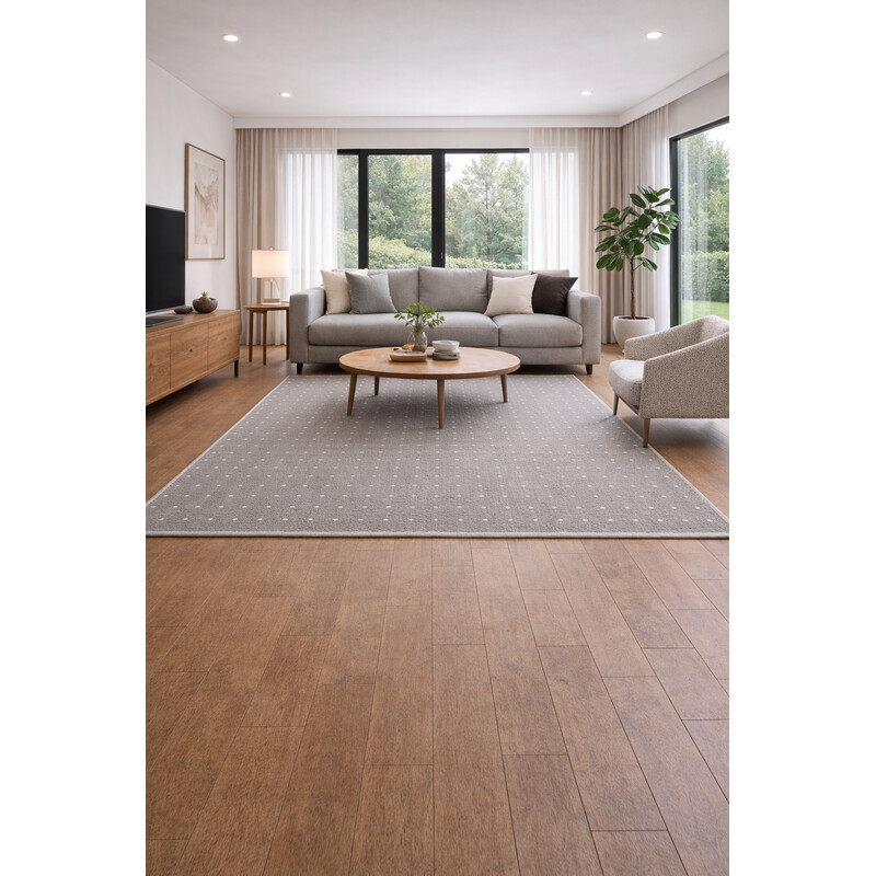 Světle šedý koberec je velmi praktický, protože díky své neutrální barvě ladí k jakémukoliv nábytku. Nejlépe se hodí do obývacího pokoje nebo ložnice, ale obstojí i v zatěžovanějších místnostech, jako je chodba. Je totiž vyroben z pevného polypropylenu BCF a má krátký smyčkový vlas. Je obšitý ze všech stran a snadno udržitelný.