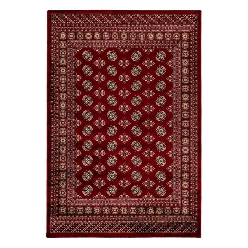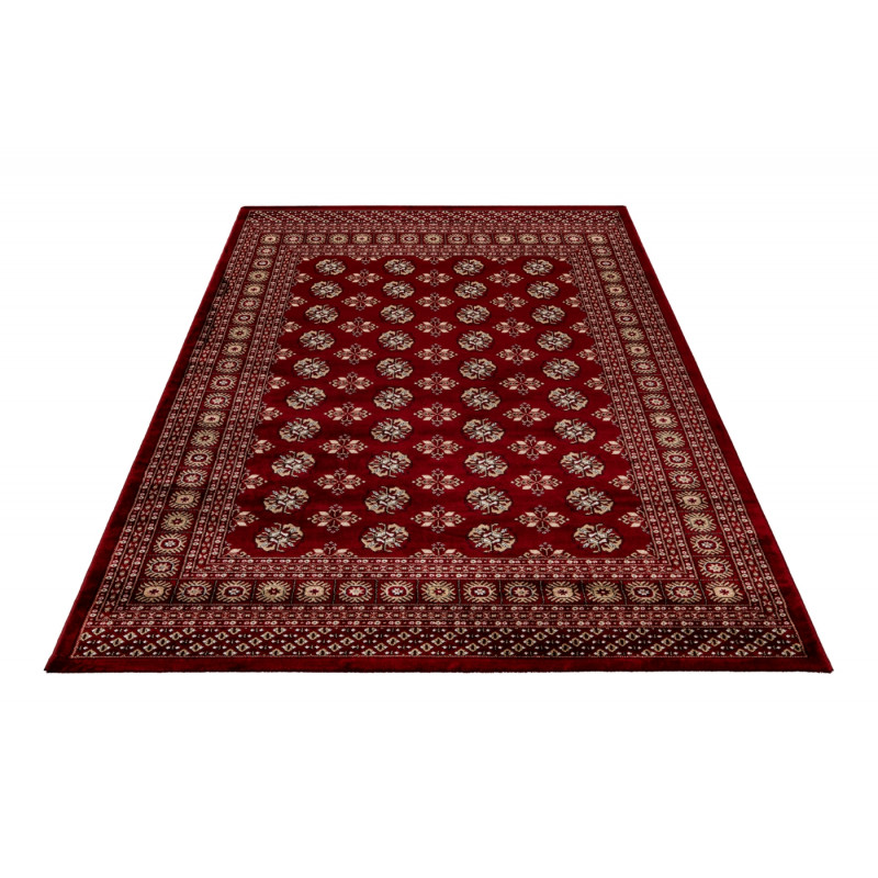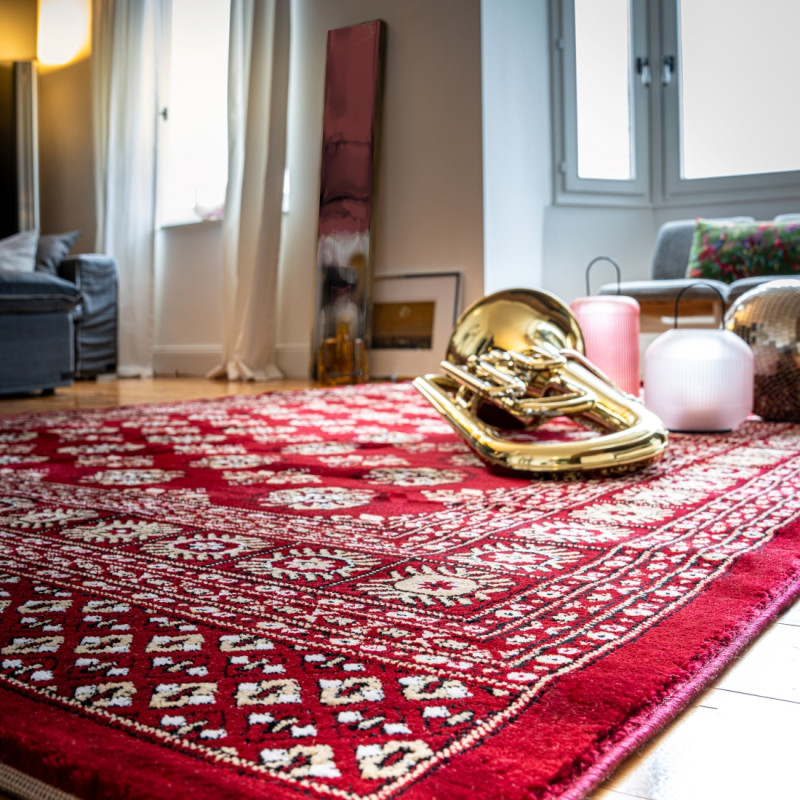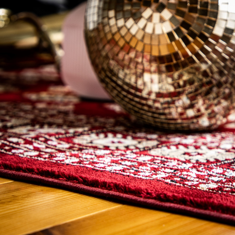 Výrazně červený koberec má propracovaný středový motiv s několika vrstvami lemování od tenkých proužků po větší ornamenty. Jedná se o orientální kousek vyrobený z polyesteru. V kombinaci se středně vysokým střiženým vlasem je koberec velmi příjemný na došlap, a proto se nejlépe hodí k posteli nebo pohovce. Můžete ho bez obav položit i na podlahové topení.
