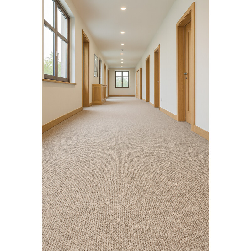 Světle béžový koberec Rubin s velmi pevnou nízkou smyčkou, který odolá vyšší zátěži v kanceláři. Smyčkový vlas je velmi praktický a snadno se udržuje, což je klíčové v prostředích, kde je třeba udržovat vysokou úroveň čistoty a často uklízet. Smyčky jsou vyrobeny z polypropylenu. Ten je známý svou vysokou odolností proti skvrnám a snadnou údržbou. Koberec...