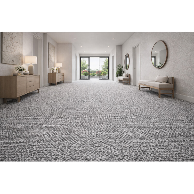 Světle šedý metrážový koberec Orion 9289 má zajímavý vzor, který kombinuje různě barevná vlákna. V interiéru proto vypadá nevšedně a moderně. Krátký smyčkový vlas je vyroben z polypropylenového vlákna, a proto se jedná o pevný a odolný koberec, který je také snadný na údržbu. Další výhodou je kompatibilita s podlahovým topením nebo efektivní útlum zvuku.