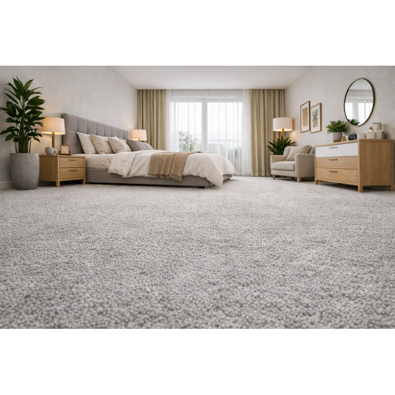 Světle šedý koberec, který se vyznačuje neskutečně hebkým povrchem. Vyrábí se totiž z jemného polyesteru a má vyšší střižený vlas. Tyto parametry zajišťují, že je koberec příjemný na dotek a komfortní na došlap, což oceníte zejména v ložnici u postele nebo v obývacím pokoji u pohovky.