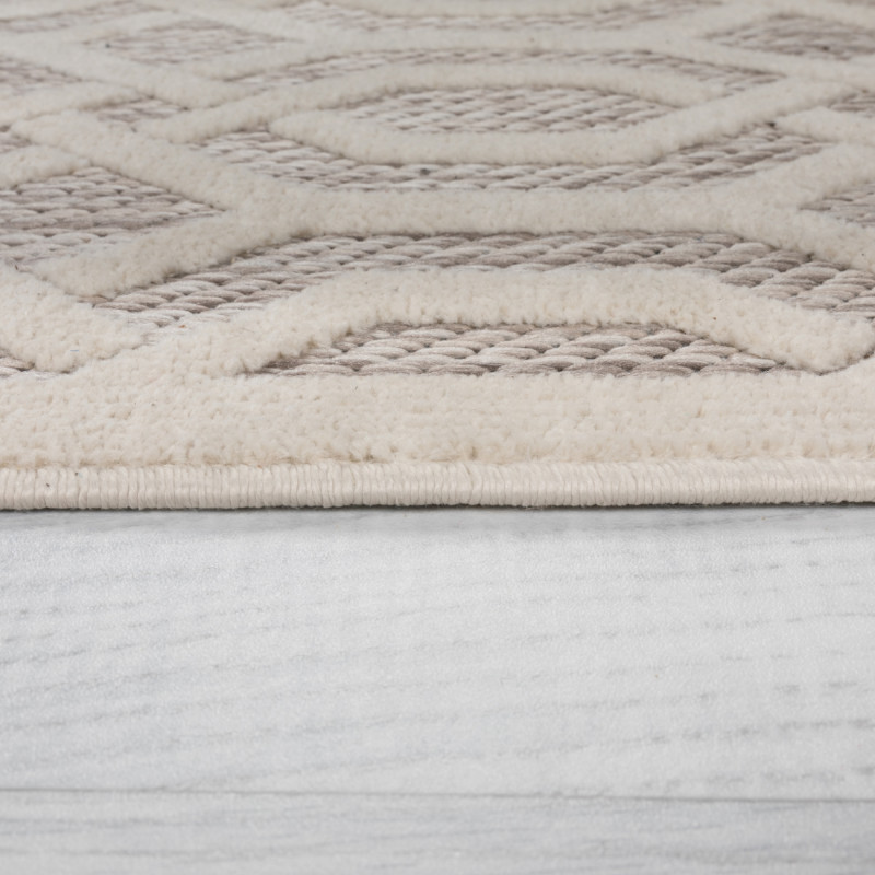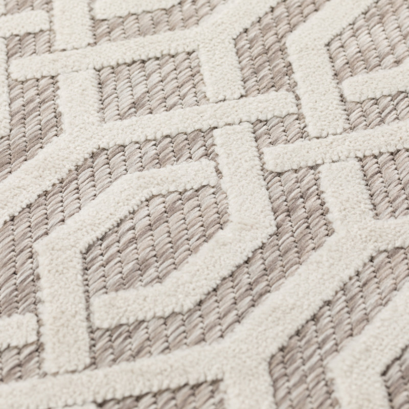 Nízko-profilový koberec v přírodní béžové barvě najde uplatnění nejen v obývacím pokoji, ale také v chodbě, kuchyni nebo na terase. Základem jsou velmi krátké, pevné a odolné smyčky z polypropylenu, které jsou doplněné krátkým střiženým vlasem, což vytváří zajímavý 3D vzor. Koberec je snadný na údržbu i čištění - můžete ho dokonce opláchnout vodou.